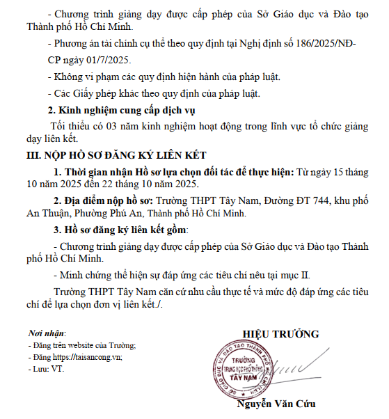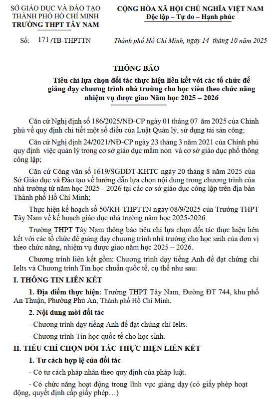 Thông báo lựa chọn đối tác giảng dạy chương trình Tiếng Anh và Tin học theo định hướng quốc tế trong nhà trường NH 2025-2026